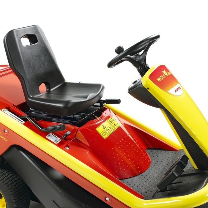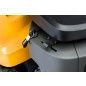 - un grand bac de ramassage (240L) avec une manette pour vider le bac sans descendre du siège mais surtout dans une position naturelle pour forcer avec assistance à vérin à gaz.